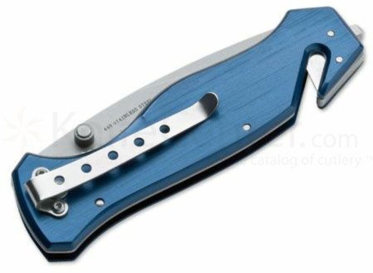 Boker Magnum (01MB365) "Police Rescue" Manual Folder, 3.375" 440A Satin Drop Point Blade, Rescue Hook, Blue Aluminum Handle, Liner Lock