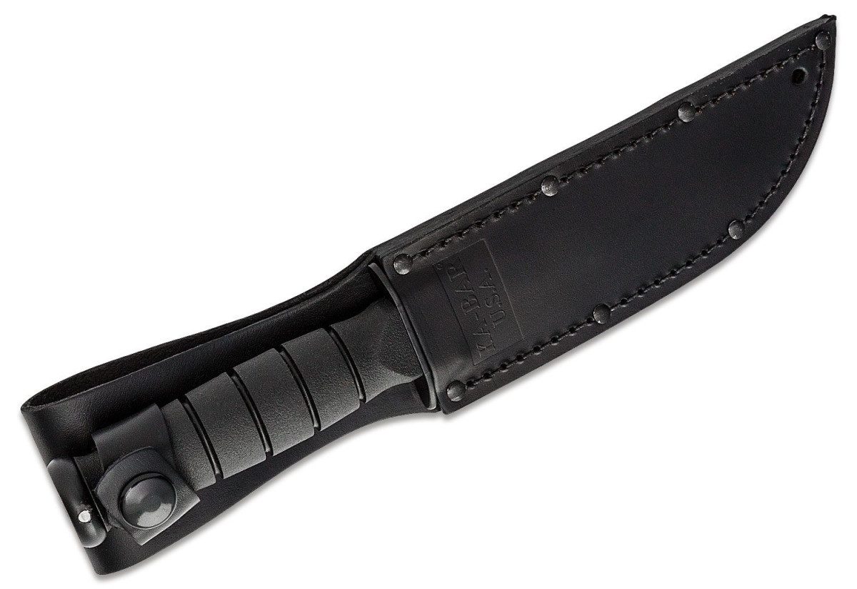 KA-BAR (1256) "Short Ka-Bar" Fixed Blade, 5.25" 1095CV Black Powder Coated Clip Point Blade, Black Kraton G (Rubber) Handle, Black Leather Sheath