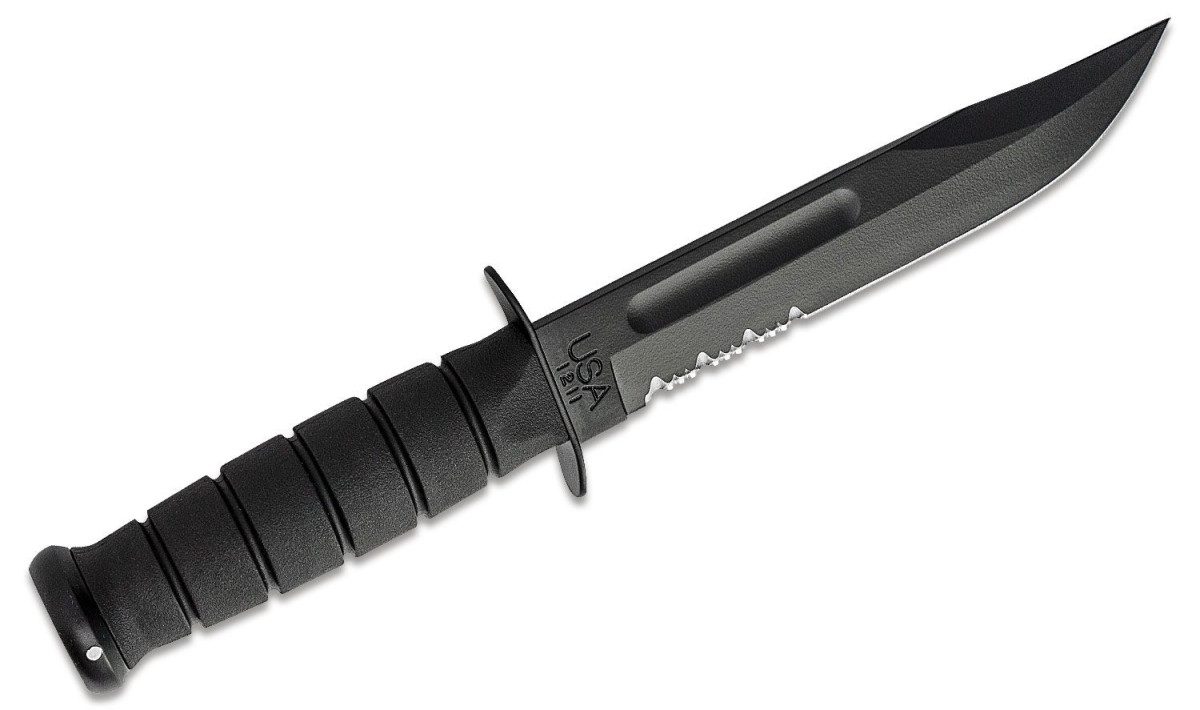 KA-BAR (1212) "Full Size Black KA-BAR, Serrated Edge" Fixed Blade, 7" 1095 Cro-Van Black Partially Serrated Clip Point Blade, Black Kraton G Synthetic Handle, Black Leather Sheath