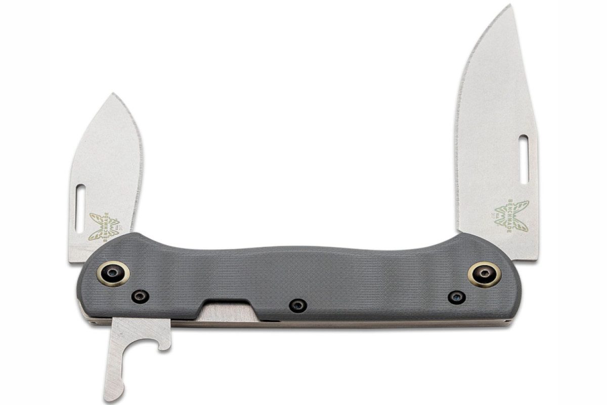 Benchmade (317) “Weekender” Non-Locking Folder, 2.97/1.97″ CPM-S30V Satin Drop Point/Clip Point Blades, Cool Gray G10 Handle with Bottle Opener, Slip Joint