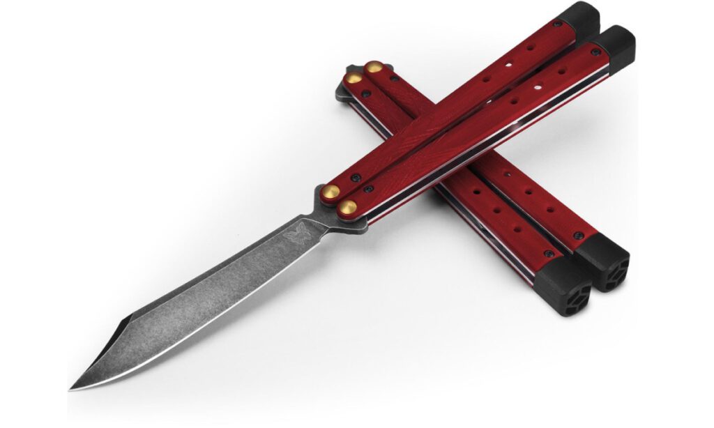 Introducing the 99 Necron™, a high-performance butterfly knife with a focus on flipping, available in two highly customizable variants that pay homage to Benchmade’s roots with a return to our Bali-Song’s classic form with added bonus features. Optimized for expert flippers with latchless G10 handles and a CPM-S30V Scimitar blade, fine tune the Necron™’s balance and speed with adjustable tungsten weights and extendable handles for your perfect flip and desired feel. Available with Jade or Ruby Red G10 handles, and with a trainer variant for mastering your technique, the Necron™ is finished off with a hollow diamond texture found on the safe handle to give the user a tactile indication of which handle to grasp to avoid a sharp bite.
