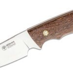 A sturdy and compact hunting and outdoor knife based on the design by successful knifemaker, Jerry Lairson. Due to the two finger grooves, a variety of holding options provide a wide range of applications. The grooved blade spine additionally enhances a safer grip of the knife. The guyacan wood handle scales have been attached with mosaic pins and add a special touch to this attractive model. Blade steel is T6MoV. Includes a precious embossed leather sheath.