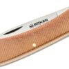 The Magnum Rangebuster is a lightweight slipjoint pocket knife with a satin-finished 440A blade. It is opened by nail nick and does not lock. Studs and liners are made of nickel silver, and the flat handle scales are made of brown micarta. The Rangebuster is one of the classic knife forms that have gained international fame from Solingen and are appreciated by countless workers all over the world. It is known to American farmers as a Sodbuster, to miners in the mines of northern France as a Miner and to Solingen workers as a Hippekniep.