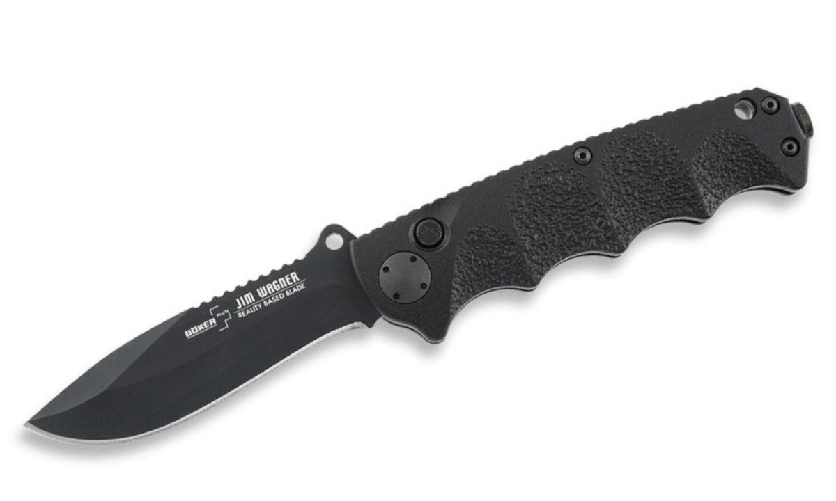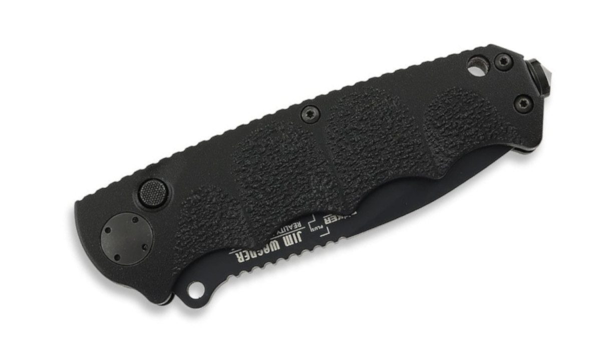 These Jim Wagner models were developed based on the demand for a Reality-Based Blade in a smaller, lighter version. The black coated aluminum handles are based on our famous KAL 74 series, and the blades remain unchanged. The impressive result is a lightweight but sturdy automatic knife that proves to be reliable and highly functional. The black coated AUS-8 steel blades are locked in the open position. Also includes reversible pocket clip and glass breaker tip. The legendary Jim Wagner RBB in a more handy version with recurve blade.