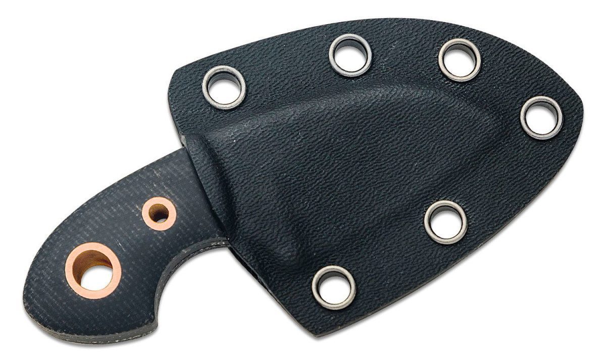 The entirely black Boker Plus Gnome by Jesper Voxaes inspires with its ultimate compactness, which is precisely why it ensures outstanding carrying comfort. The titan-coated blade is made of edge-retaining D2, so that the little powerhouse easily masters everyday cutting tasks. The Micarta handle scales feature two hollow copper studs, the rear of which can be used as a lanyard hole. The ergonomics of the handle guarantee an excellent grip and make the knife not only a pleasure to hold, but also a useful companion. The custom-fit Kydex sheath is equipped with a ball chain that underlines the claim of the Boker Plus Gnome as a neck-knife.