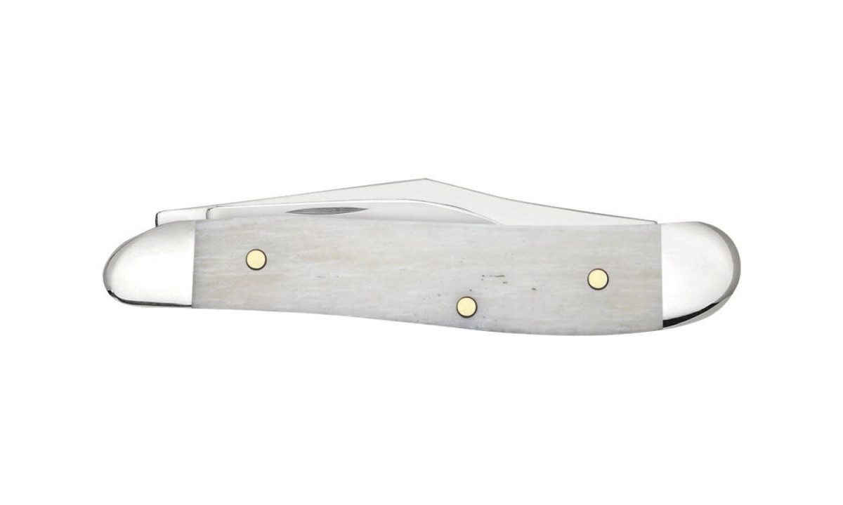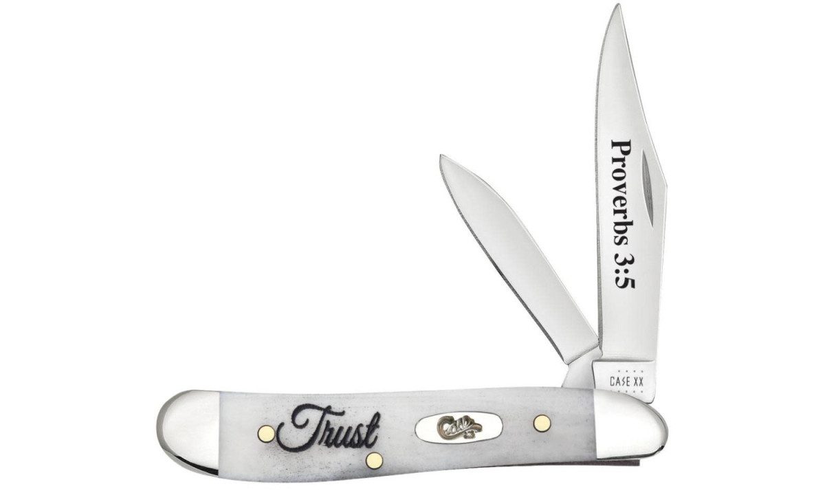 Case (60867) “Peanut” Non-Locking Folder, 2.1″/1.53″ Stainless Steel Mirror Polish ‘Proverbs 3:5’ Engraved Clip Point/Pen Blades, ‘Trust’ Design Natural Bone Handle, Slip Joint