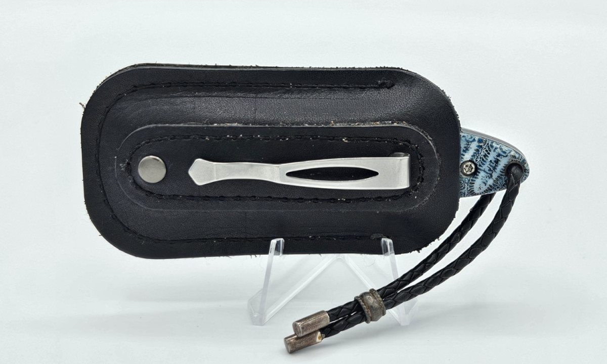 / CASTLEGATE, Manual Folder, 2.375″ 416 Layer Damascus Drop Point Blade, Blue Brain Coral Handle Scales with Titanium Liners & Damascus Bolster with Diamond Inlayed Thumb Stud, Custom Leather Sheath, Liner Lock