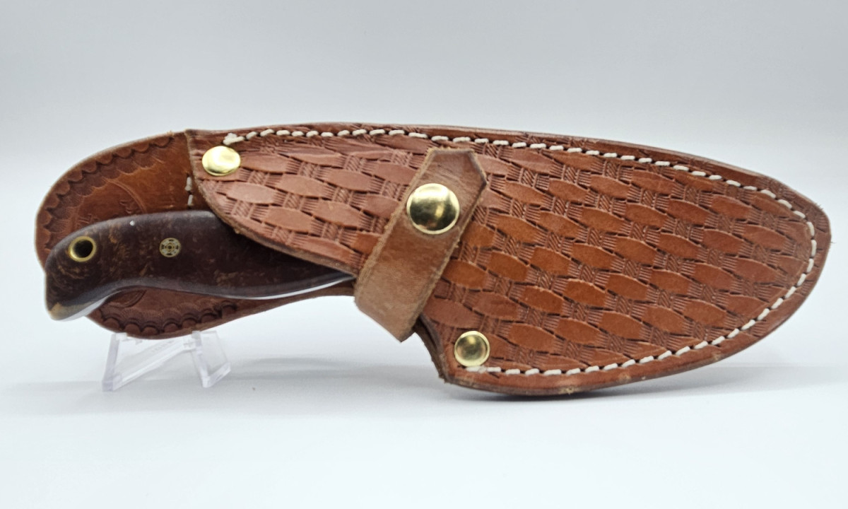 CASTLEGATE, Fixed Blade, 2.75″ 1095 Satin Drop Point Blade, Black Ash Burl Wood Handle with Custom Pins & Brass Bolsters, Custom Leather Sheath