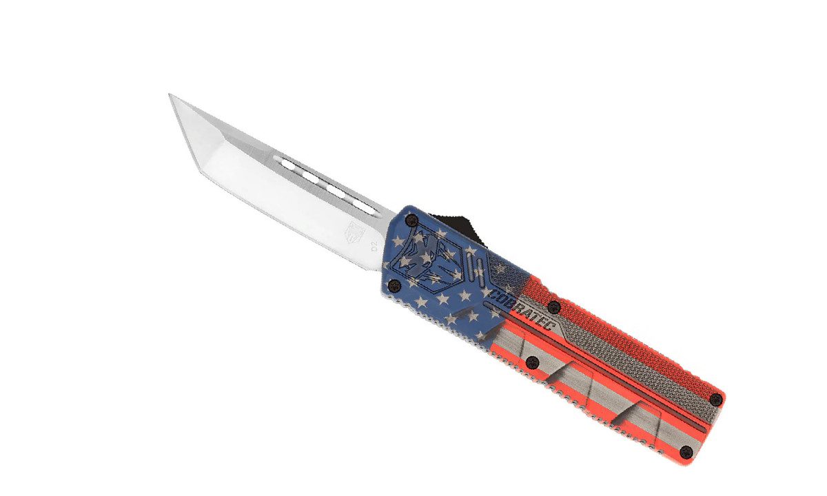 CobraTec Knives Lightweight American Flag OTF (out the front) knife has a Cerakotedhigh grade aluminum alloy handle with great feel, excellent action and loaded with a high quality D2 Steel blade that is suited for everyday usage.This knife features a pocket clip and a nylon sheath. All CobraTec Knives are backed by COBRATECS LIFETIME WARRANTY.