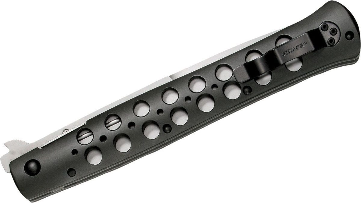Cold Steel’s Ti-Lite folding knives evoke the sleek speed and rebellious lines of the classic 1950’s switchblade. They feature sharp and strong bead-blasted Carpenter CTS XHP Alloy blades, and CNC milled 7075 Aluminum handles which are finished with a protective EDP (Electric Discharge Plating) coating. The Ti-Lites are equipped with our patent pending, stainless steel leaf spring locks (proven, in our tests, to hold upwards of 145lbs). For ease of carry, the Ti-Lites come equipped with a small, but unobtrusive steel pocket clip, and can be opened rapidly by using the thumb studs or by snagging a quillon on the edge of your pocket as you draw your knife out.