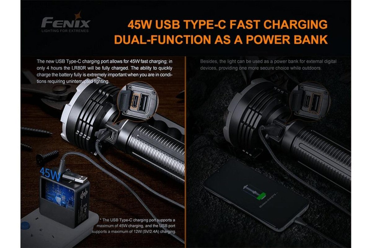 The Fenix LR80R is the definition of a super bright handheld searchlight. This flashlight will impress everyone with an outstanding 18000 lumens powered by the built-in 7.2V/12000mAh Li-ion battery pack. Capable of 1130-meter beam visibility, it can be used to find any object in the dark. Dual switch design allows you to enter high and low-brightness modes quickly. With the built-in USB Type-C charging port, you can fast charge the Fenix LR80R in a matter of hours or use the discharge function to charge your other devices. A unique and user-friendly brightness downshifting sensor function is designed to avoid high temperatures at close-range lighting. You can easily carry the LR80R with the detachable handle or use the tripod socket for outdoor photography. Battery level indicators will tell you when to charge the LR80R with the included charging cable. This powerful flashlight can serve multiple purposes, including search and rescue missions.