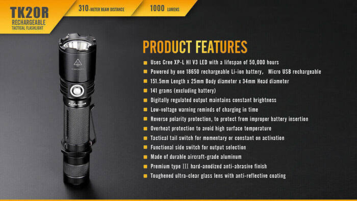 The first rechargeable TK series light is here. The Fenix TK20R Rechargeable LED Flashlight is a beast with maximum output of 1000 Lumens and a maximum throw distance of 1,017 Feet (310 Meters). This tactical flashlight is the best in its class. The Fenix TK20R rechargeable flashlight measures only 5.9 inches and is constructed with durable aircraft-grade aluminum. The Fenix TK20R Flashlight has an integrated Micro USB charging port for easy charging without having to worry about additional battery chargers. You won’t have to take your battery out to charge anymore; the flashlight also is the battery charger. Even if you’re on the go, you can charge this light easily in your vehicle via the included Micro USB Cable. The light is powered by one 18650 battery or two CR123 batteries. This will be the best flashlight you will ever own…you will see why this is a top-seller.