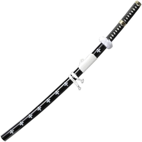 ANIME SWORD, BLACK CORD WRAPPED HANDLE, FUR COVERED HAND GUARD, SATIN BLADE, BLACK SCABBARD W/WHITE CROSSES AND WHITE TIES