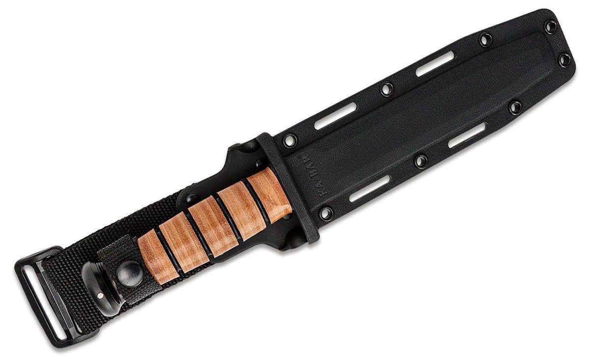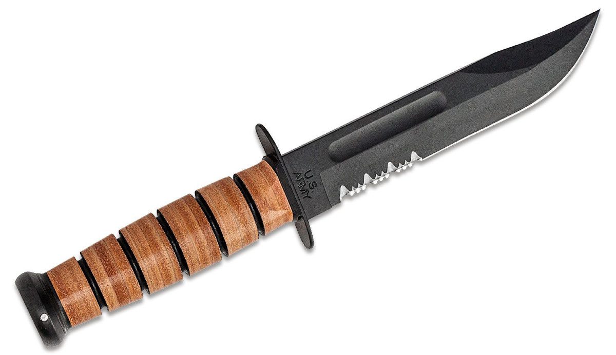The traditional KA-BAR marked for Army personnel and featuring a partially serrated edge to aid in cutting synthetic and looped materials. Tang stamped U.S. ARMY. Hard plastic MOLLE compatible sheath included.