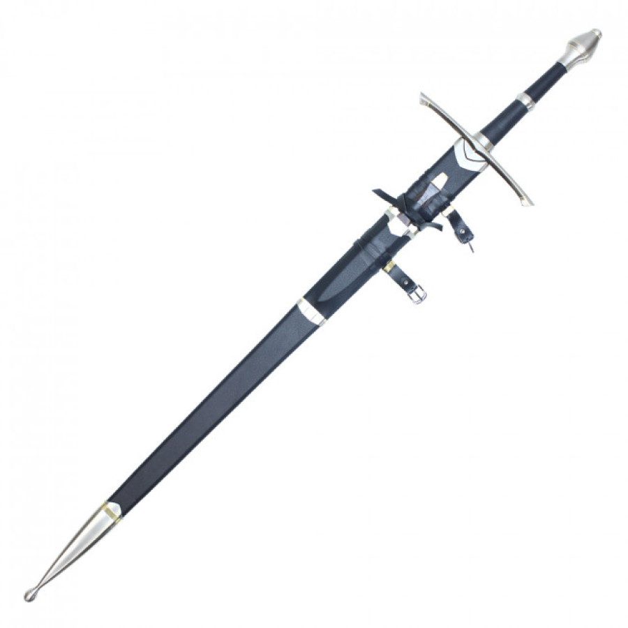 The Medieval Ranger Sword with Dagger is made from stainless steel and has a double-edge blade. A fuller runs down the length of the blade. Next, the sword features a cruciform cross guard. The handle continues with double-handed grip. There is a silver-colored ring in the center of the grip. It matches the cross guard and scent stopper-shaped pommel. This sword comes with a black scabbard. The scabbard also holds a small dagger which comes included.