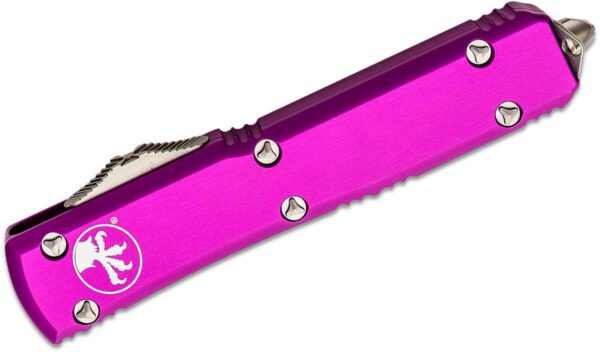 Microtech (120-10VI) “Ultratech” Dual Action OTF, 3.35″ M390 Stonewashed Bayonet Blade, Violet Anodized 6061-T6 Aluminum Handle with Glass Breaker