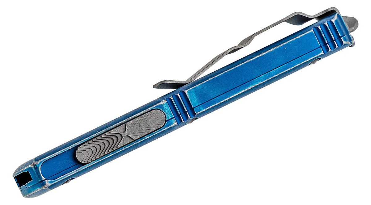 Microtech (121-10DBL) “Ultratech” Dual Action OTF, 3.35″ M390 Apocalyptic Drop Point Blade, Distressed Blue Anodized 6061-T6 Aluminum Handle with Glass Breaker