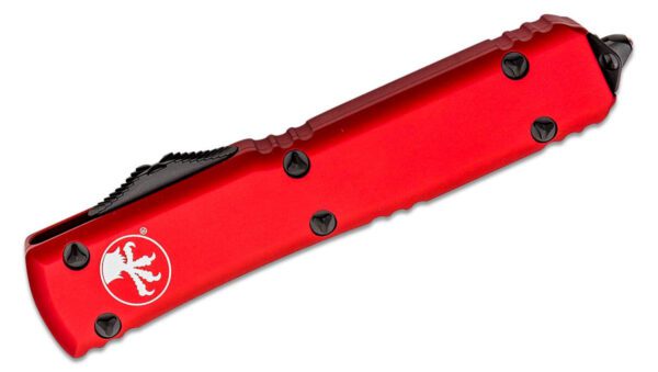 Microtech (122-1RD) “Ultratech” Dual Action OTF, 3.35″ M390 Two Tone DLC Dagger Blade, Red Anodized 6061-T6 Aluminum Handle with Glass Breaker