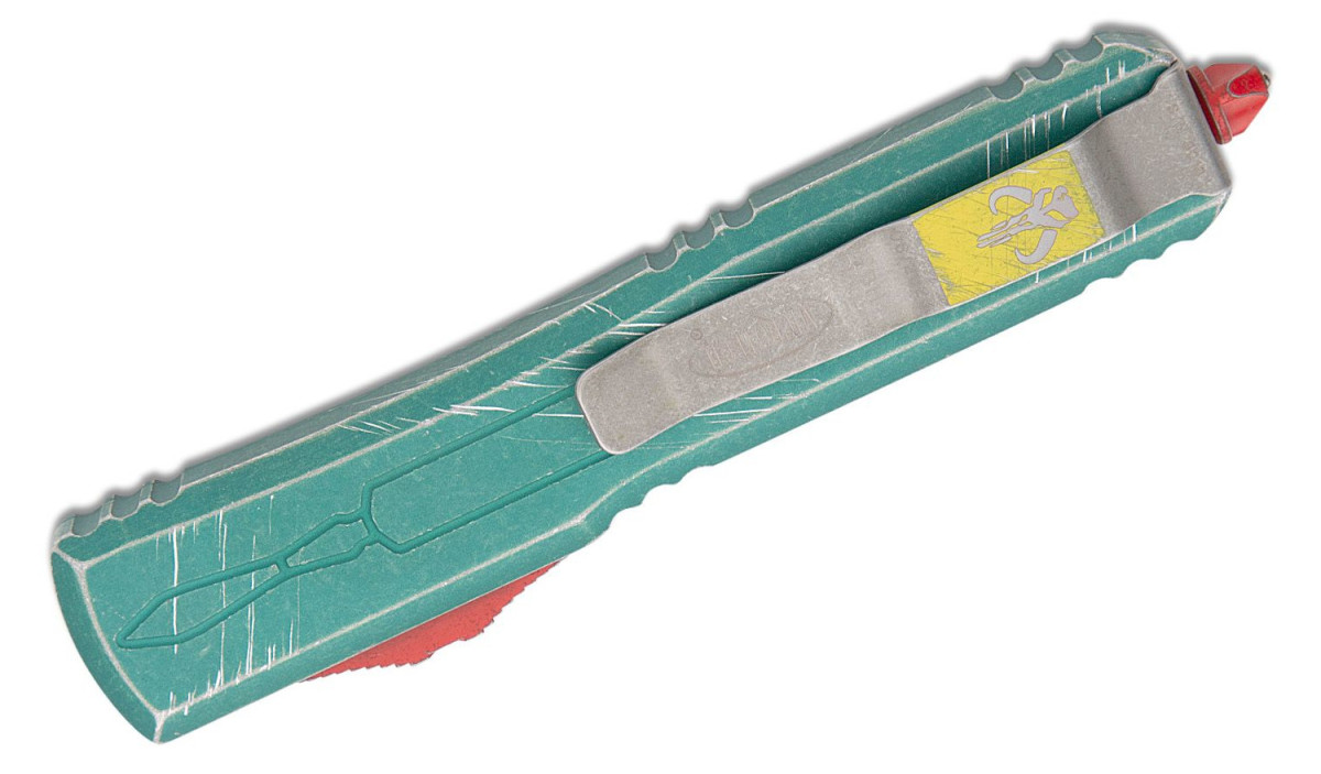 Microtech (123-12Bh) “Bounty Hunter Ultratech” Dual Action OTF, 3.35″ M390 Apocalyptic Fully Serrated Tanto Blade, Green/Red/Yellow Anodized 6061-T6 Aluminum Handle with Glass Breaker