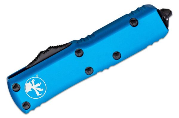 Microtech (232-1) “UTX-85″ Dual Action OTF, 3.125” M390 Two Tone DLC Dagger Blade, Blue Anodized 6061-T6 Aluminum Handle with Glass Breaker