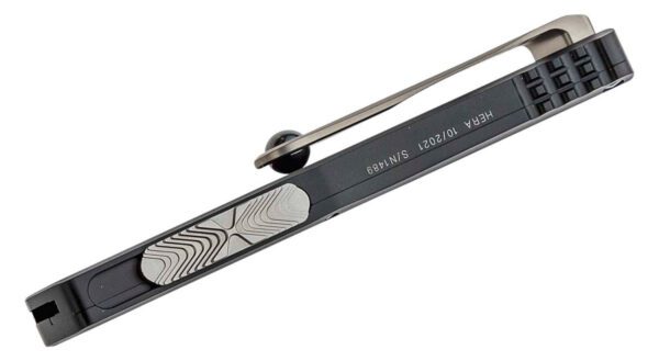 The perfect blend of utility and aesthetic, the Hera features a dual action dagger blade and streamlined body. The handle, made of black anodized aircraft aluminum, is accented with machined patches that allow for maximum grip. The most unique feature of the Hera is the pocket clip—milled from titanium and featuring a smooth ball that glides with ease into your pocket, the Hera is a beautiful addition to your everyday carry.