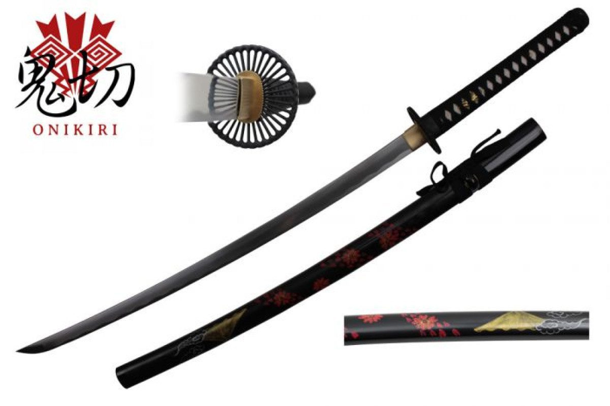 ONIKIRI, KATANA, FULLY FUNTIONAL WITH LIVE EDGE, BLACK WOOD SCABARD WITH FLOWER PAINTING, CLOTH CARRYING BAG