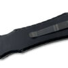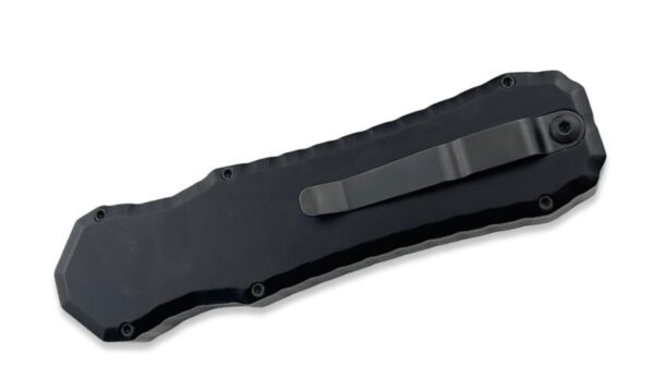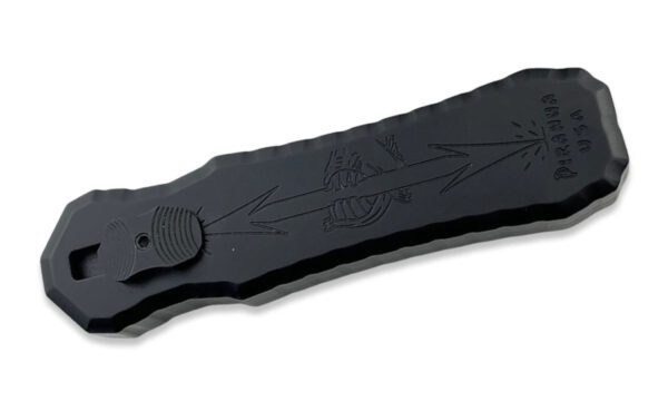 This Excalibur features a black DLC finished blade with plain edges. The handle, pocket clip and hardware are all tactical black finished. The Piranha Excalibur is a double action out-the-front automatic knife. The action on the Excalibur is solid and reliable. The handle is anodized 6061-T6 aluminum with a sliding firing button on front and a titanium tip-down carry pocket clip on back. The double-edge blade is 154-CM stainless steel.