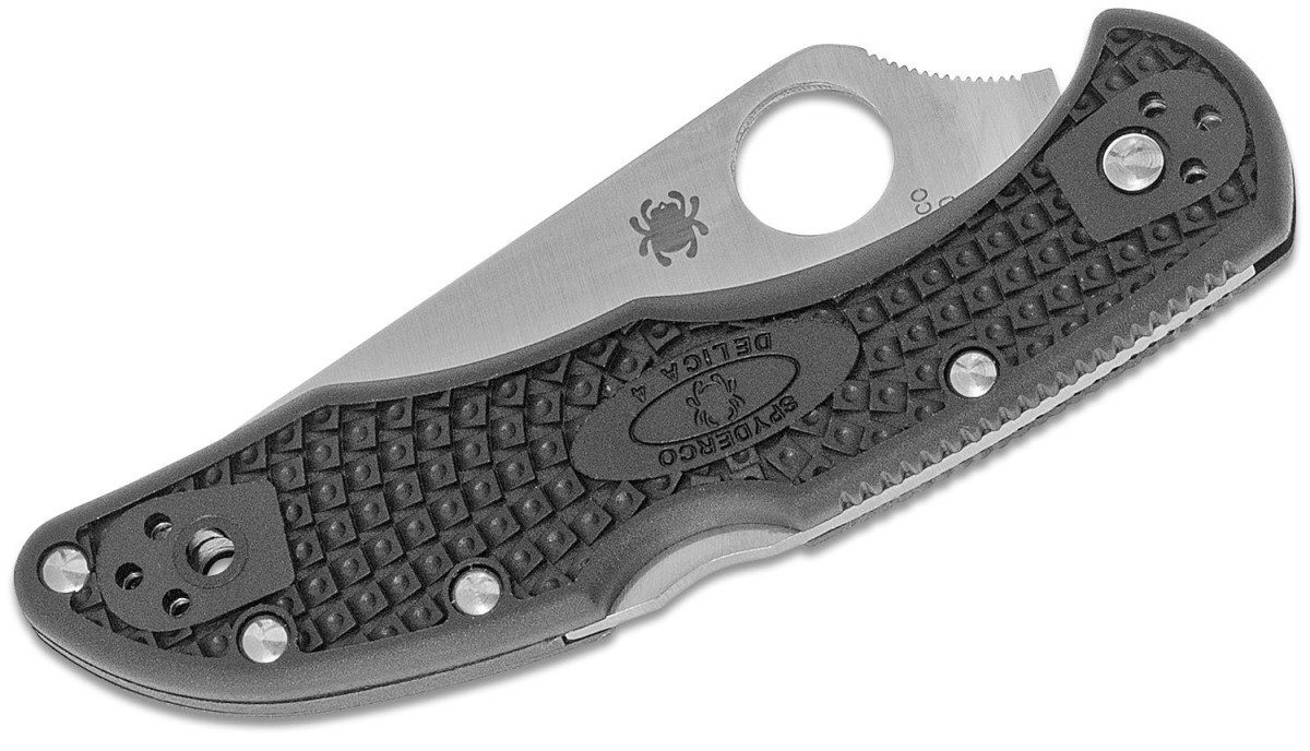 In 1990 Spyderco shook things up by introducing the Delica. First of it’s kind on the market, this folder opened up the knife market to lightweight performance, one-hand open pocketknives that just about everyone could afford. It is an evolutionary work in progress and the next level is here with the new Delica4. This model now has screw construction making cleaning and adjusting easier. The fiberglass reinforced nylon handles come molded with Bi-Directional Texturing for preferred traction and improved ergonomics. Inside the handle dual skeletonized stainless steel liners make the knife stronger without adding weight and make an anchor for all external and internal components to attach through adding sturdiness and rigidity. The VG-10 blade is flat saber-ground with a stronger tip and larger 13mm opening hole. Added to the blade’s spine is slip resistant jimping. Phosphor bronze washers smooth out the open/close action and the clip is upgraded to a four-way tip-up, tip-down, left- or right-handed clip.