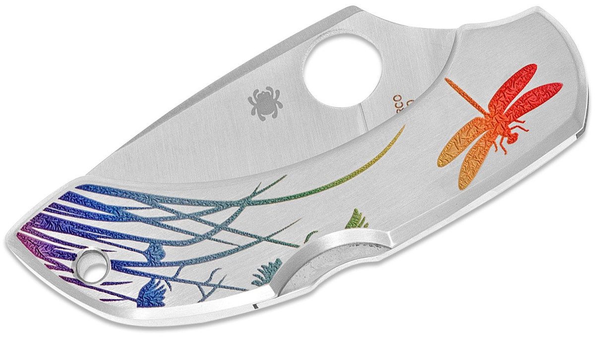 At Spyderco we design and manufacture knives to be functional, elemental cutting tools you will use and can rely on for years to come. Function and cutting performance are our primary focus but we do on occasion create something equally beautiful with artistic value. We’re glad to introduce you to our C28PT DragonFly Tattoo folder with multi-color dragonfly etching. We believe it offers the best of both worlds. Beauty and function. These two words bring to mind different images to different people. Architects think buildings, engineers picture construction projects, knife people think sharp and shiny things, like the Spyderco C28PT Dragonfly Stainless Tattoo with dragonfly etching. Like all Spyderco DragonFlys its cutting ability far surpasses its diminutive package and innocuous name. It starts with a functional VG-10 blade and an all stainless steel handle. Then it’s beautified with bright poly-chromatic dragonfly art etched into the handle. The VG-10 full flat-ground blade is 2-1/4” inches of cutting aptitude with a cusp on the blade’s spine to naturally position the thumb in control over the sharp edge. Blade and handle geometry create a variety of grip angles and leveraging points so when held and used the knife feels and reacts like a larger tool in the hand. Even the position of the Spyderco Round Hole, relative to the pivot, is precise for smooth opening, hitting all the correct pressure points in the hand ergonomically. It carries right-hand tip-up with a steel pocket clip that can also be used as a money clip. Our knifemaking commitment is to manufacture performance and quality that is consistently dependable.