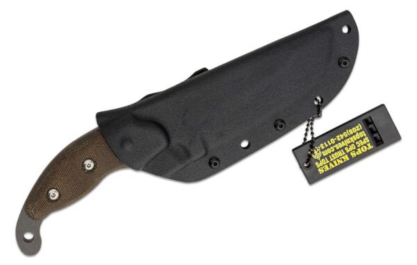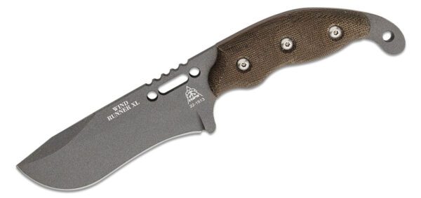 The Wind Runner XL is a re-worked version of a classic TOPS hunting knife. This new version sports our famous Tungsten Cerakote finish with green canvas Micarta handles to provide grip even when they’re wet. This is the larger of the two Wind Runners and it is a great all-around hunting knife. Every detail about the blade was included to make processing animals easy. The subdued tip allows the user to skin without worrying about puncturing a hide. The recurve and sweeping belly are ideal slashing tasks for gutting, skinning, and caping. The high grind on the thick stock make it strong, but with a very sharp edge. The handle is comfortable in standard hunting grips and the green canvas Micarta will help the user keep that grip even when it’s wet (a must when processing game). The Kydex sheath provides excellent retention and a low-profile carry option.