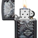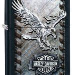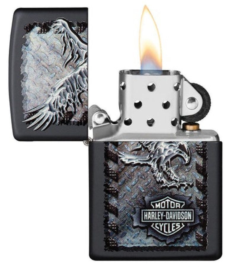 This black matte Harley-Davidson® lighter features the classic Harley-Davidson® eagle swooping down to grab the Harley-Davidson® logo. Comes packaged in a gift box. For optimal performance, fill with Zippo lighter fuel.