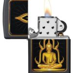 Rays of enlightenment radiate from this golden Buddha design. Using color imaging this design came to life, on a Black Matte lighter Carry this small piece of wisdom in your pocket. Comes packaged in a gift box. For optimal performance, fill with Zippo lighter fuel.